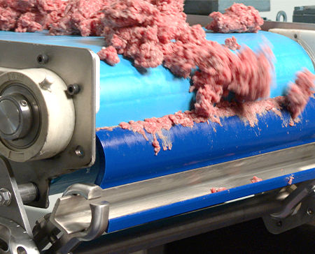 例えば、粘着性の高い肉、油、パン・菓子生地といった食品はコンベヤの排出箇所で次のベルト・シュートに重力によって落ちますが、一部の食品はベルトに固着したまま、システムのリターン側(下部)にそのまま流れていくことが頻繁に起きます。このキャリーバックでは搬送物がローラーに巻き込み、コンベヤシステムへの混入、搬送物が床にこぼれ落ちる、固着した搬送物がそのまま、キャリヤ側(上部)に戻り、新しく投入される食品の衛生を悪くするといった問題が生じます。